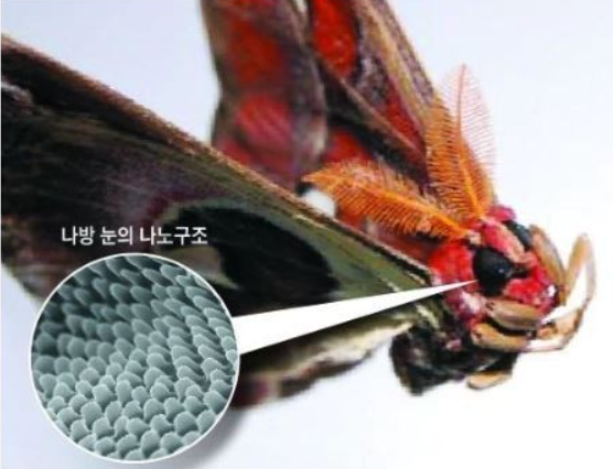 나방눈구조는 나노구조로 구조물의 크기가 빛의 파장보다 작으면 나노돌기들이 마치 굴절률이 연속으로 변하는 효과를 갖게되어, 빛은 반사하지 않으므로 반사방지기능을 나타낼수 있다.